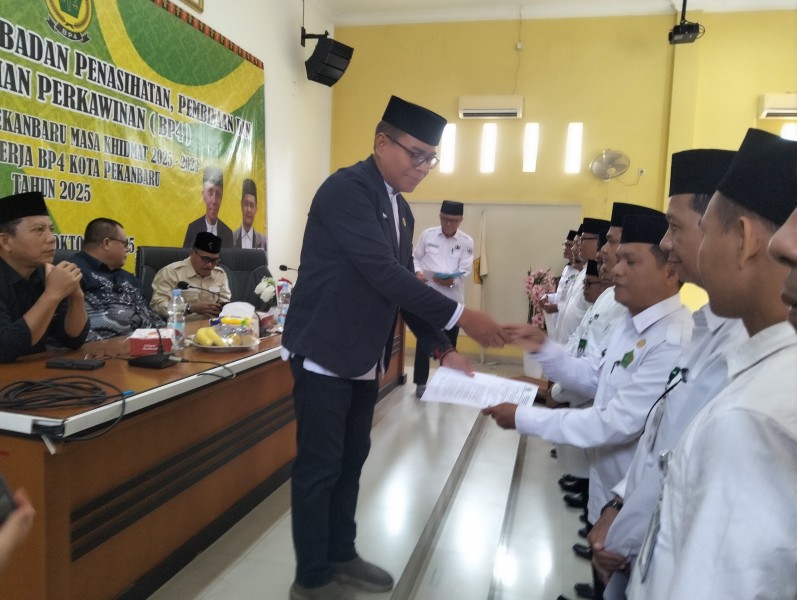 Rcn.com (Pekanbaru) - 14 Pengurus Badan Penasihatan, Pembinaan dan Pelestarian Perkawinan (BP4) Kecamatan dalam Kota Pekanbaru masa bakti 2025 - 2029 dikukuhkan oleh Ketua BP4 Kota Pekanbaru Drs. H. Marzai, pada Rabu (15/10/2025) di Gedung MDI Komplek Perkantoran Kemenag Kota Pekanbaru.