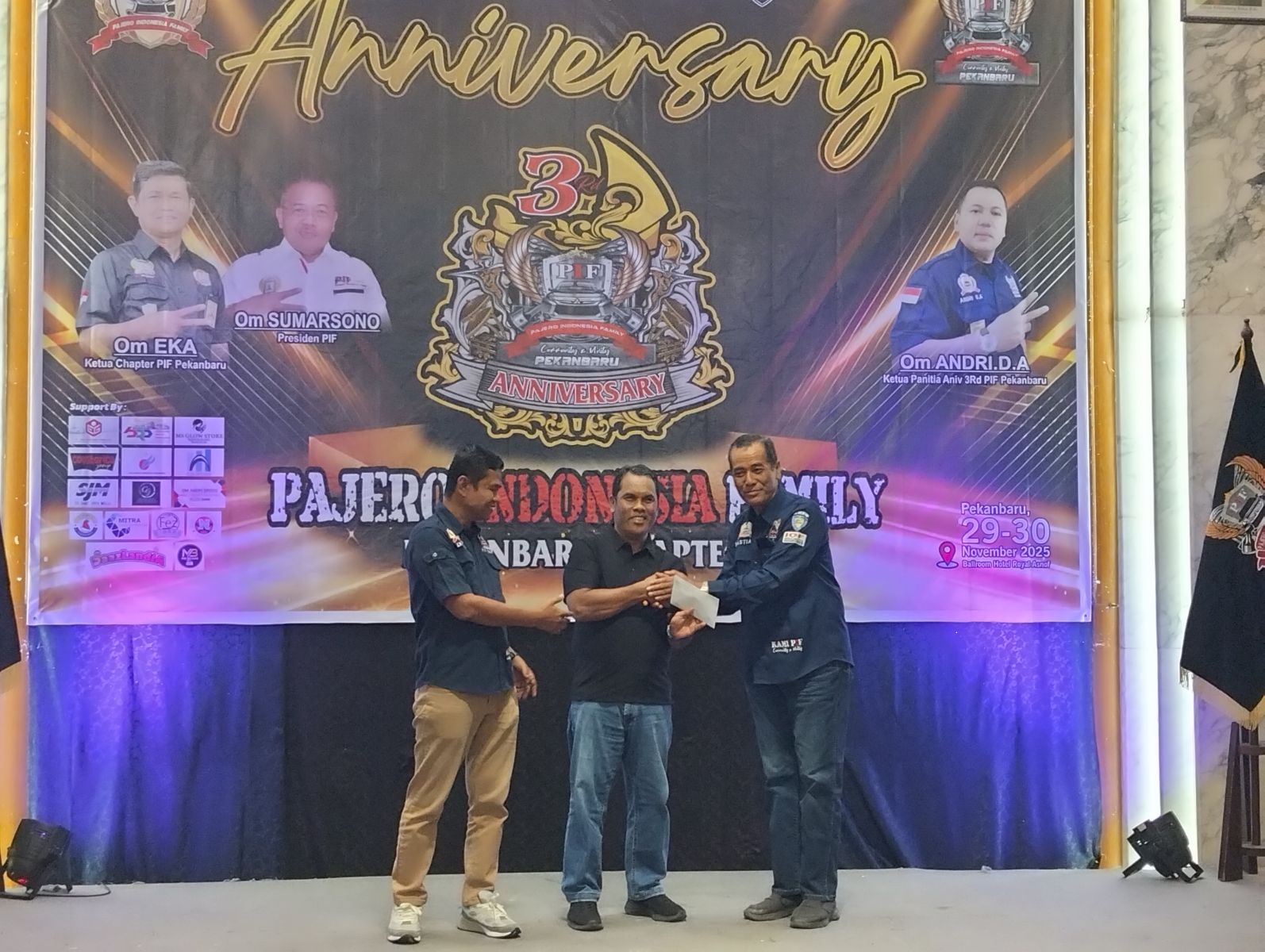 Rcn.com (Pekanbaru) - Pajero Indonesia Family (PIF) Pekanbaru Chapter, gelar anniversary ke-3 pada Sabtu (29/11/2025) di Hotel Asnof Jalan Tuanku Tambusai Pekanbaru.Terlihat Om Om dan Tante Tante ramai memadati ruangan acara.Untuk diketahui bersama sebutan kepada anggota PIF adalah Om bagi laki laki dan Tante bagi perempuan.