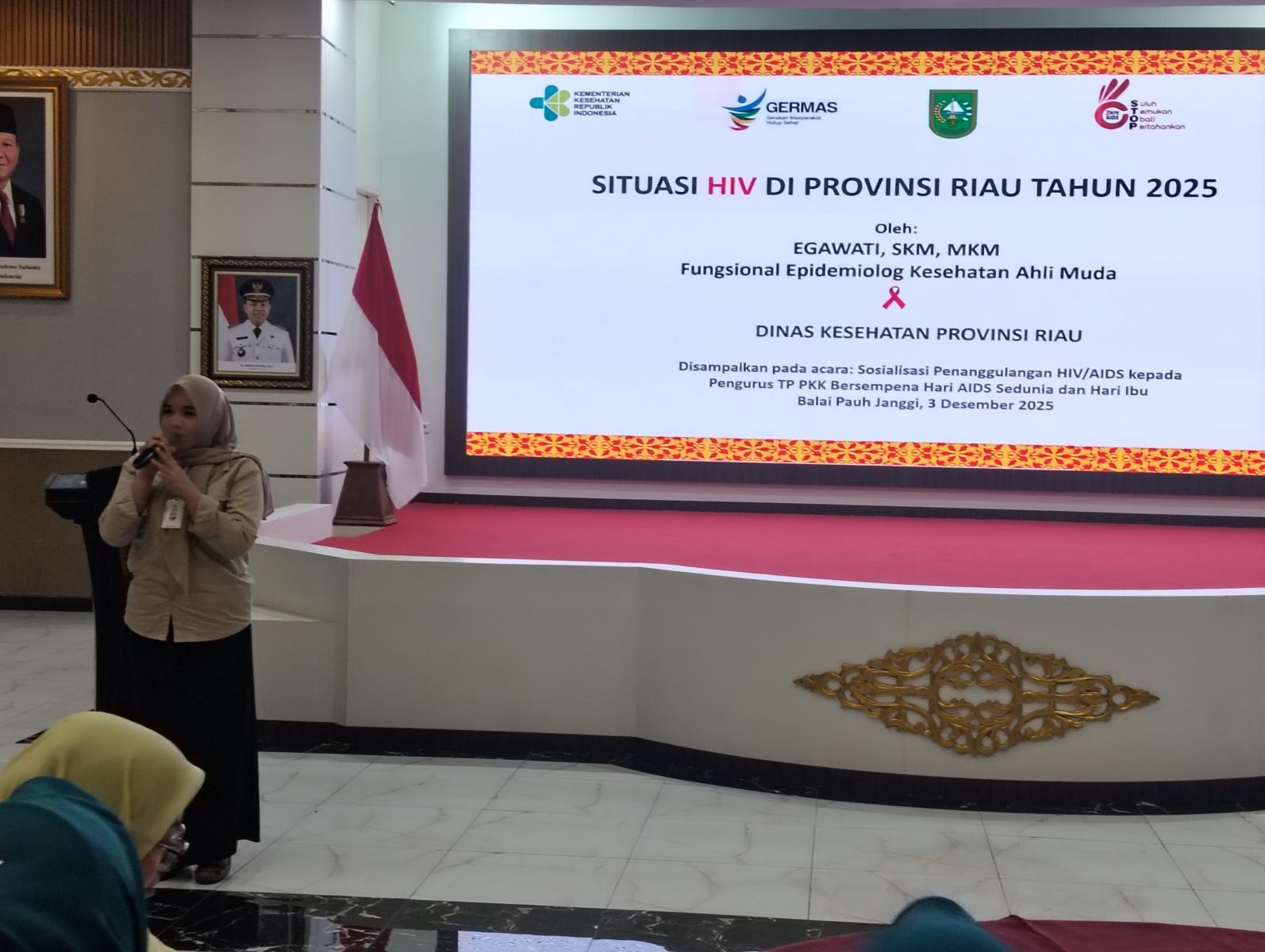 Untuk diketahui bersama kegiatan dilaksanakan pada hari ini 3 Desember 2025 bertempat di Balai Pauh Jingga Gedung Daerah Provinsi Riau.Peserta kegiatan adalah sebanyak 122 orang dengan rincian pengurus anggota PKK provinsi Riau sebanyak 25 orang, pengurus tim dan anggota PKK kota Pekanbaru sebanyak 75 orang, undangan dan panitia Dinkes propinsi Riau sebanyak 20 orang, narasumber sebanyak 3 orang yaitu satu penanggung jawab program HIV Dinas kesehatan Provinsi Riau, Tim penggerak PKK provinsi Riau dan persatuan dokter spesialis kulit Indonesia (Perdoski) Provinsi Riau, metode pelaksanaan dengan penyampaian materi oleh narasumber, diskusi, tanya jawab, pemutaran video serta disediakan doorprize bagi peserta yang aktif diakhir acara dan kemudian dorprize bagi peserta yang beruntung dengan hadiah voucher menginap di hotel Mutiara Merdeka, bingkisan dan hadiah serta voucher lainnya yang disponsori oleh Asosiasi Dinas kesehatan Provinsi Riau.