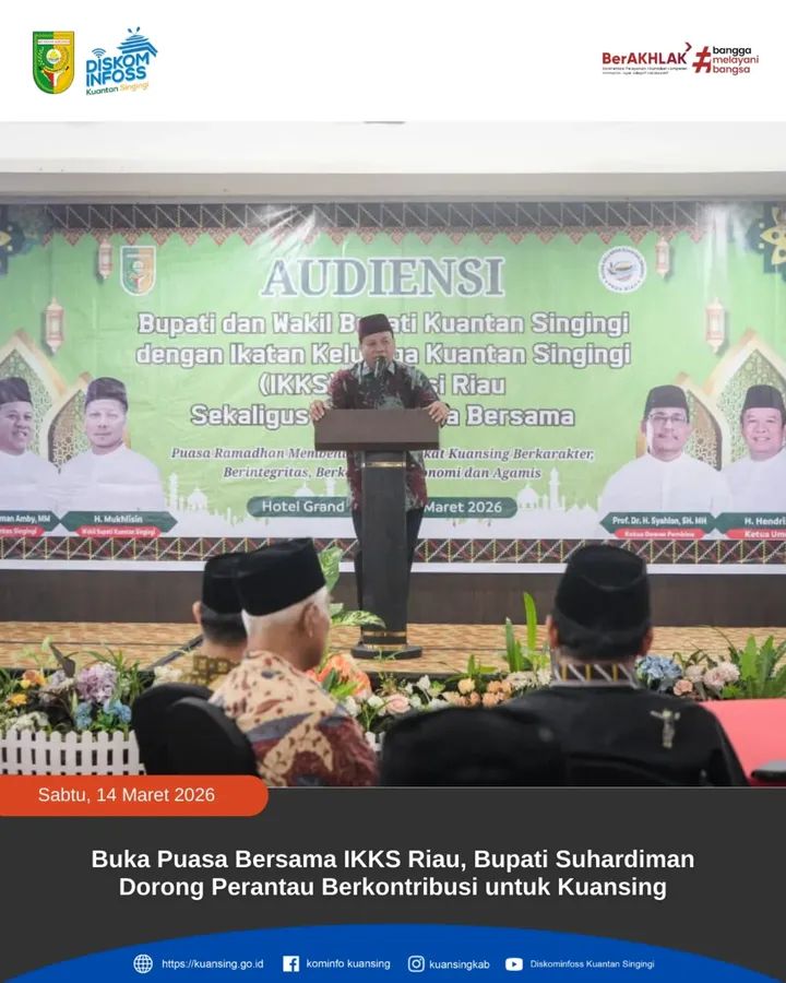 Hal tersebut disampaikan Bupati Suhardiman Amby saat menghadiri audiensi bersama Ikatan Keluarga Kuantan Singingi (IKKS) Provinsi Riau yang dirangkaikan dengan kegiatan buka puasa bersama di Pekanbaru, Sabtu (14/3/2026).
